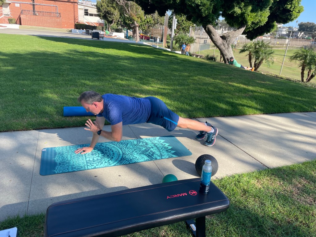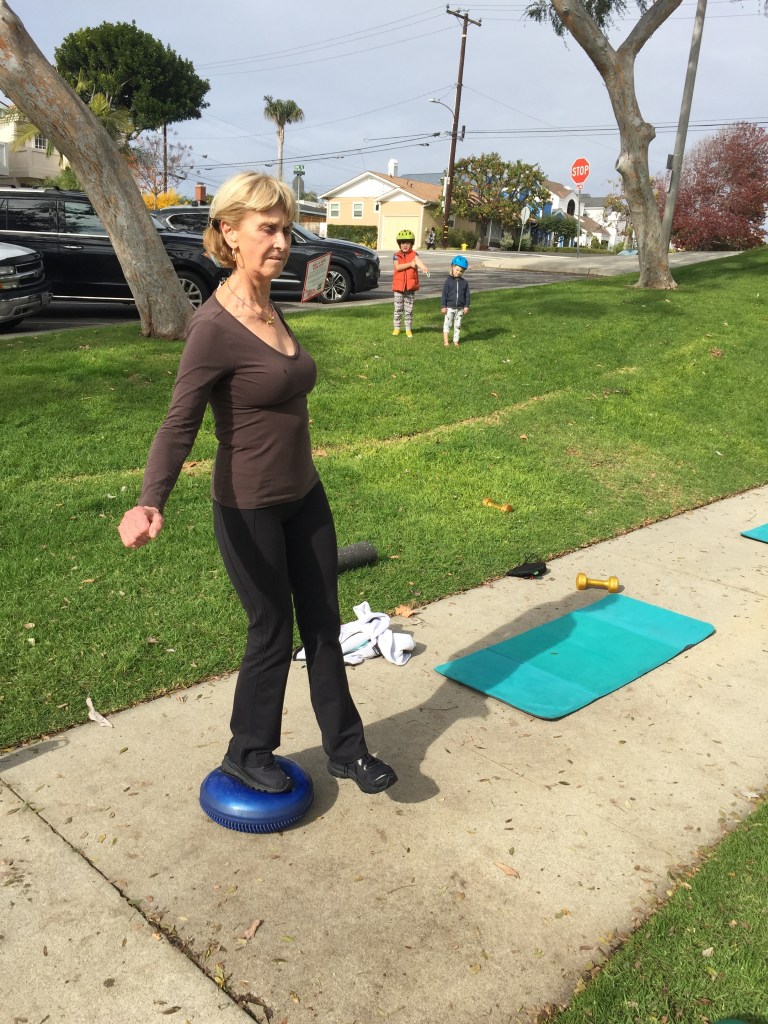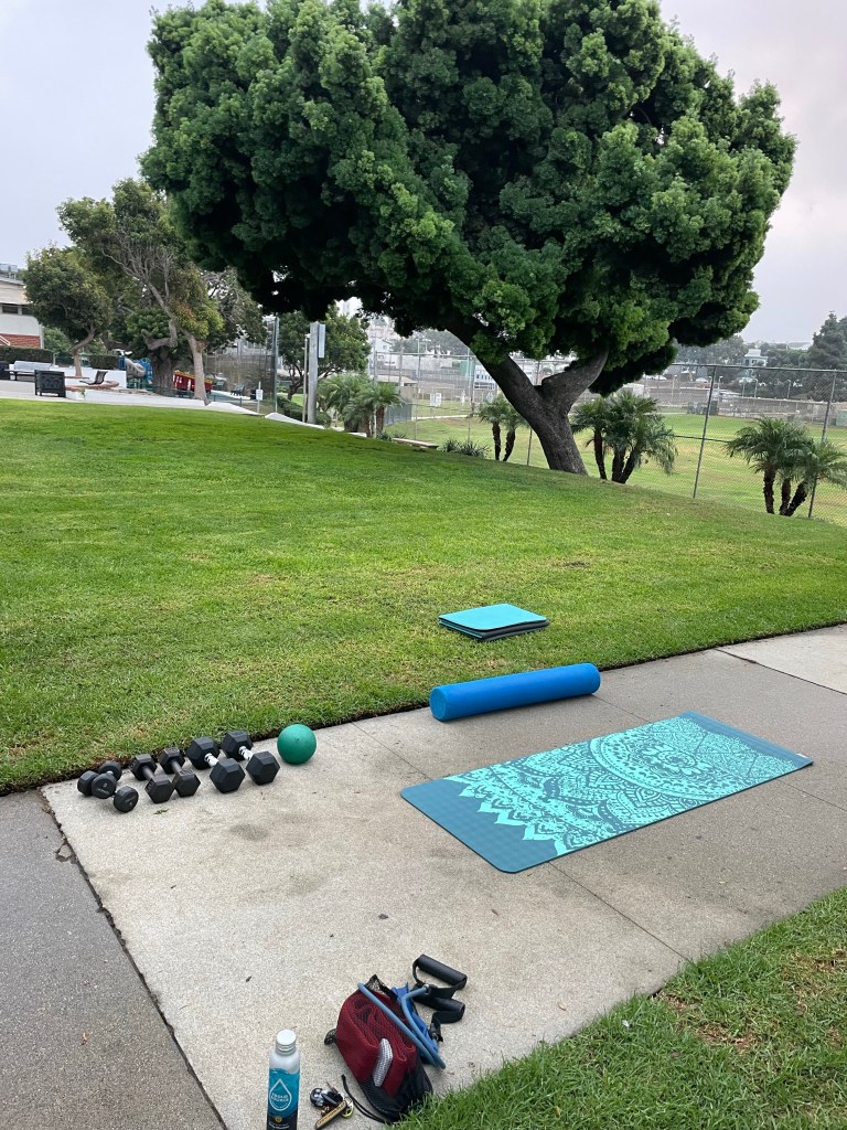PS notice the kids in the background. They’re always fascinated by us adults moving, like them I’m thinking, with toys! They add so much to our days in the park, outside, enjoying nature while working out. It doesn’t get any better than this.