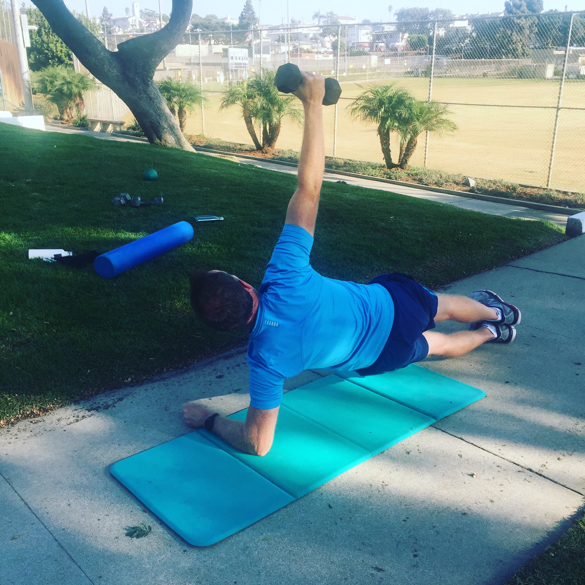 Hi! Jon’s very focused here with a 10lb dumbbell in a sidebridge. This works ‘core’ muscles which he needs to strengthen in various planes to compliment his golf and running with his athletic son. He’s got great control. He will hold for 20-30 seconds, 2 sets each side. I love that he never misses a session. Consistency is key!